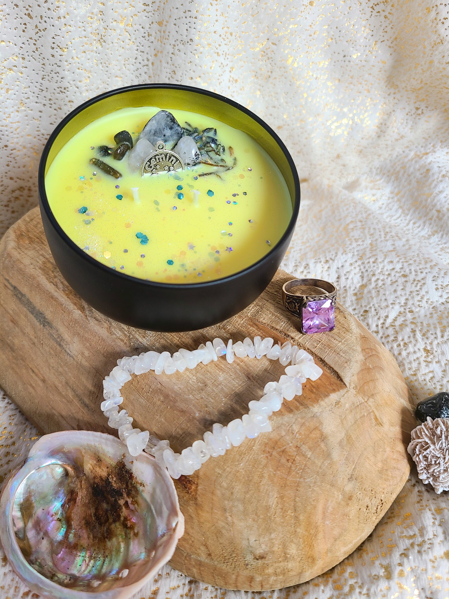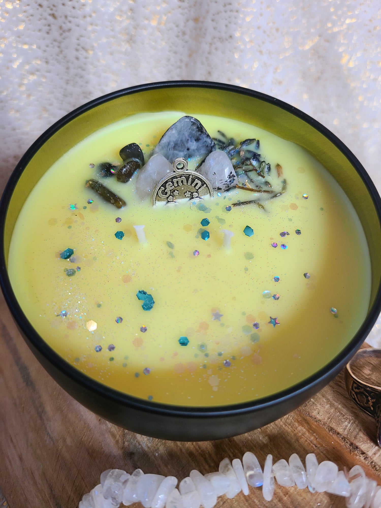 An amazing scent blend of lavender, lemon and musk. This candle is made with a soy/coconut wax and features gorgeous crystals and a metal Gemini charm. They are 6 oz pours and have 40 hours of burn time under optimal burning conditions.