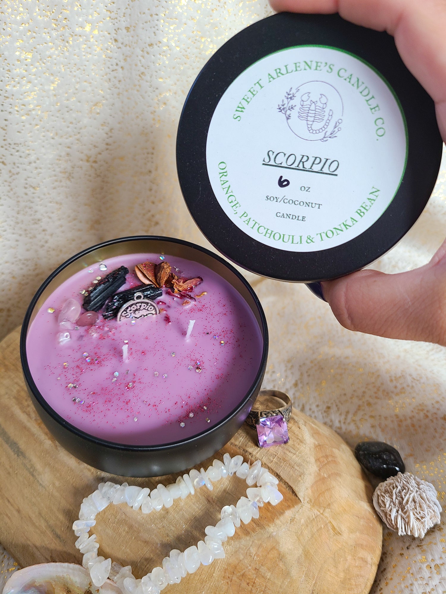 An amazing scent blend of orange, patchouli and tonaka bean. This candle is made with a soy/coconut wax and features gorgeous crystals and a metal Scorpio charm. They are 6 oz pours and have 40 hours of burn time under optimal burning conditions.